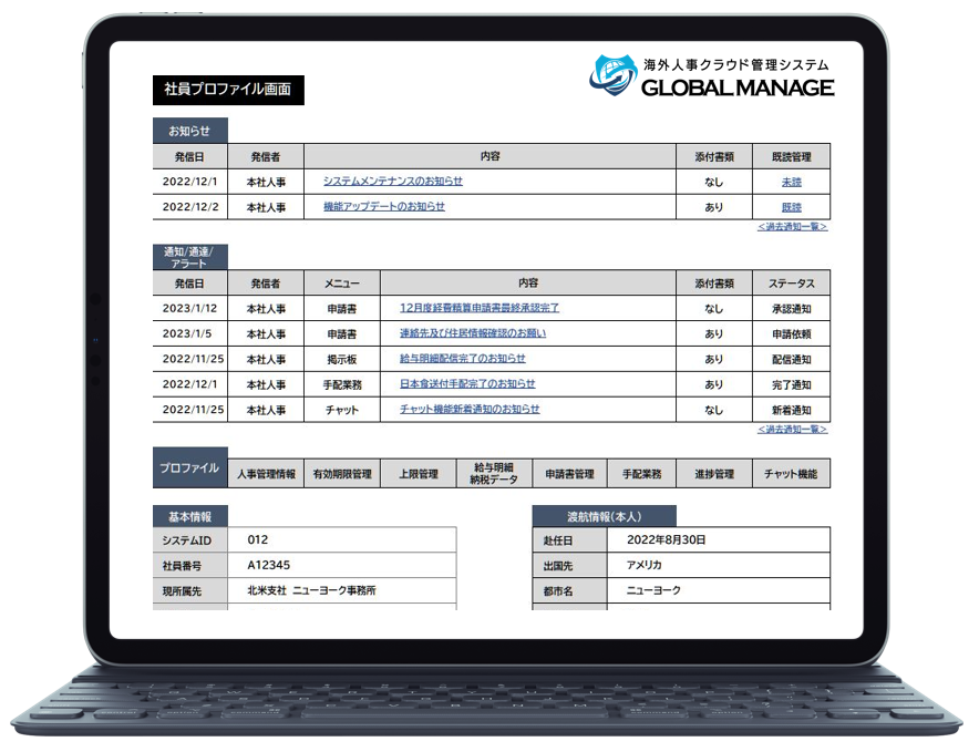 社員や家族、緊急連絡先をはじめ、会社が把握しておくべき情報を網羅した管理ページを用意。ビザやパスポート、保険、免許証等の有効期限をアラートで通知するので、万が一の更新漏れを未然に防止します。