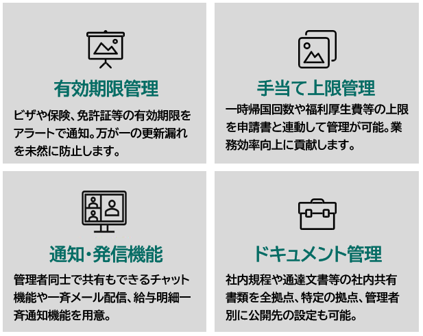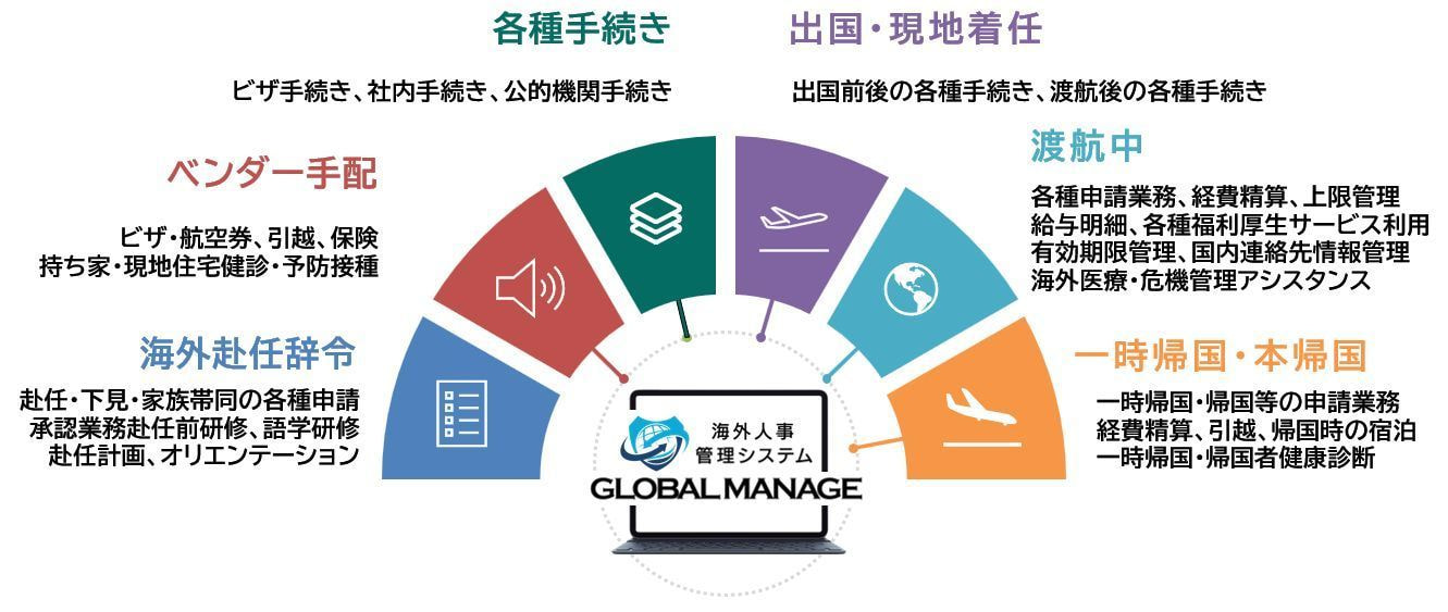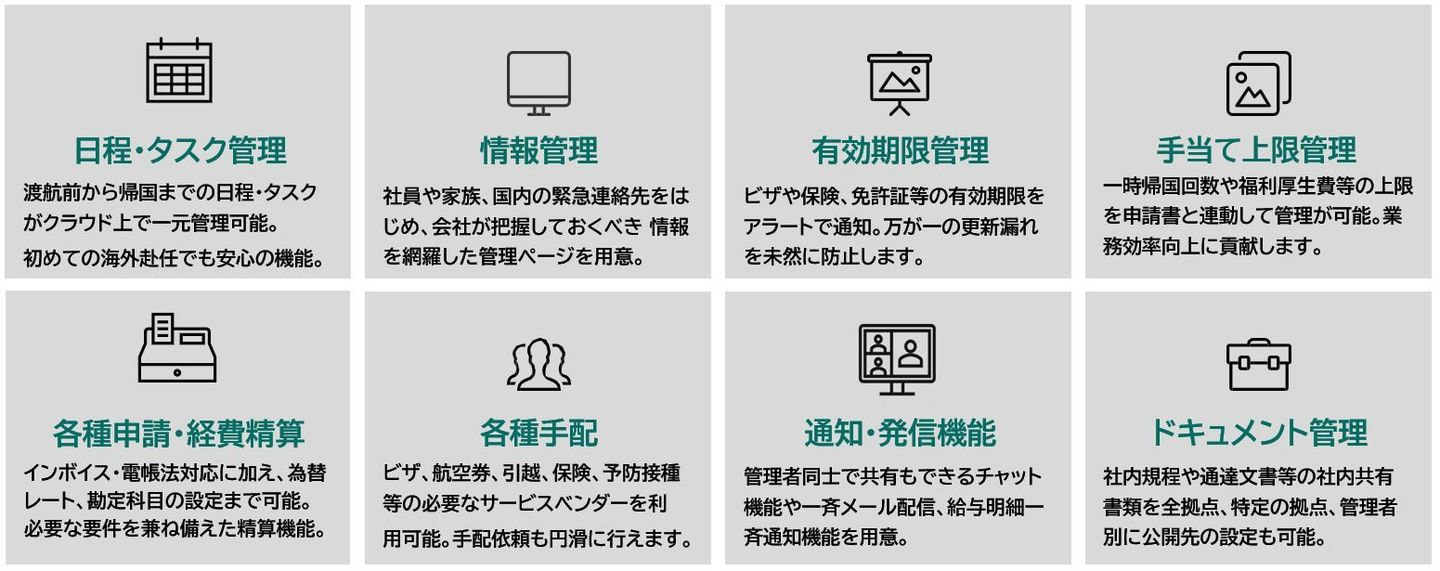 事前に用意された海外赴任者用の各種申請書をはじめ、ビザや引越の手配、現地住宅なども網羅したベンダー手配機能など、海外人事業務に必要な機能とサービスが集約されています。