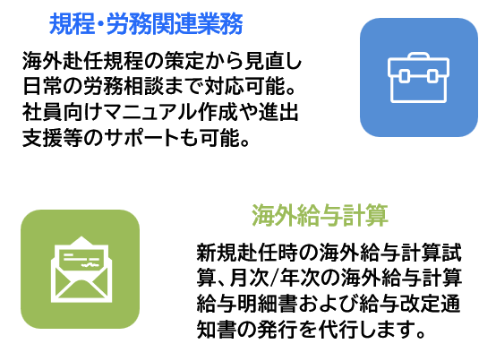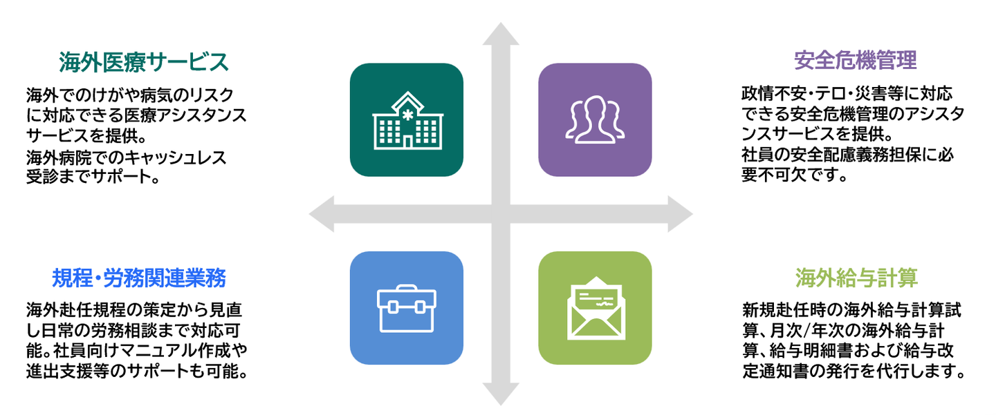 他の海外進出企業と引けをとらずに、会社の制度、社員の手当て、福利厚生を充実させることができる追加オプションサービスです。渡航国等によりご利用料金が異なります。詳細はお問い合わせください。