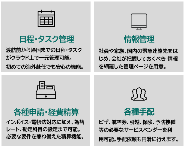 渡航前から帰国までの業務を網羅した機能を標準装備し、ご提供いたします。
